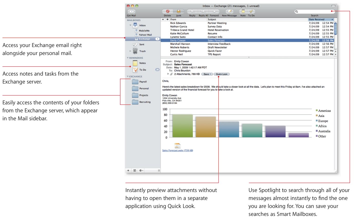 As Apple didn't shy from pointing out at their last WWDC keynote, Exchange might be a Microsoft creation but with the advent of Snow Leopard it's only OS X that includes support for the enterprise functionality out of the box. Mail, iCal and the Mac Address Book have all been upgraded to support Exchange, which for the uninitiated is Microsoft's hosted messaging, calendar and contacts system that's commonly used by businesses. The additions mean that features like calendar invitations, synchronized notes and tasks, Global Address Lists and automatic sync of messages, contacts and appointments are all integrated with Snow Leopard's standard application set, rather than demanding you buy specific software.