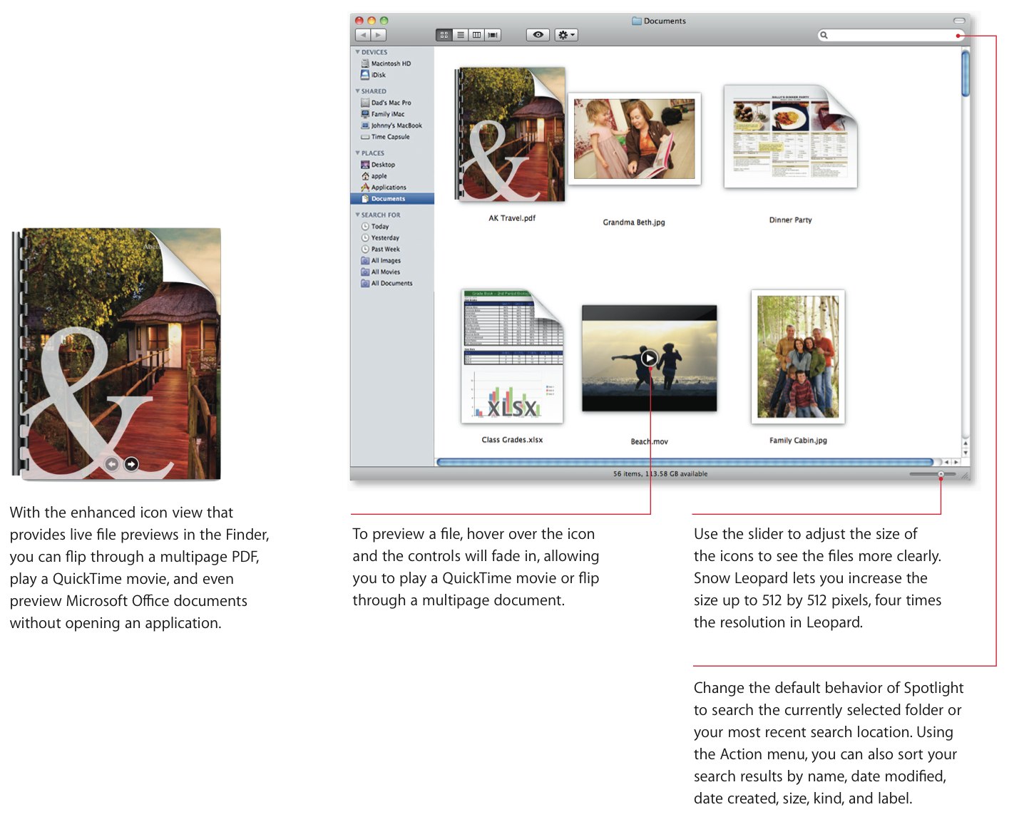 Pop-outs and quick-views have also been supercharged, with the stacks now permitting scrolling and folder navigation while in grid-view; meanwhile dragging a file from a stack or from the Finder to, say, the Mail icon will automatically pull up an Exposé view of open Mail windows, streamlining the attachment process. It's helped in no small way by the overhaul to Finder itself, something which Apple say has been a ground-up rewrite based on the Cocoa framework but all you and I need to know is far better equipped to deal with the masses of files and the prevalence of media we now stuff our computers with. Icons can be made bigger and, at 512 x 512 pixels at their maximum, are four-times the resolution of those in Leopard; more importantly each is far more interactive, with QuickTime movies playing and PDF/Office documents viewable.