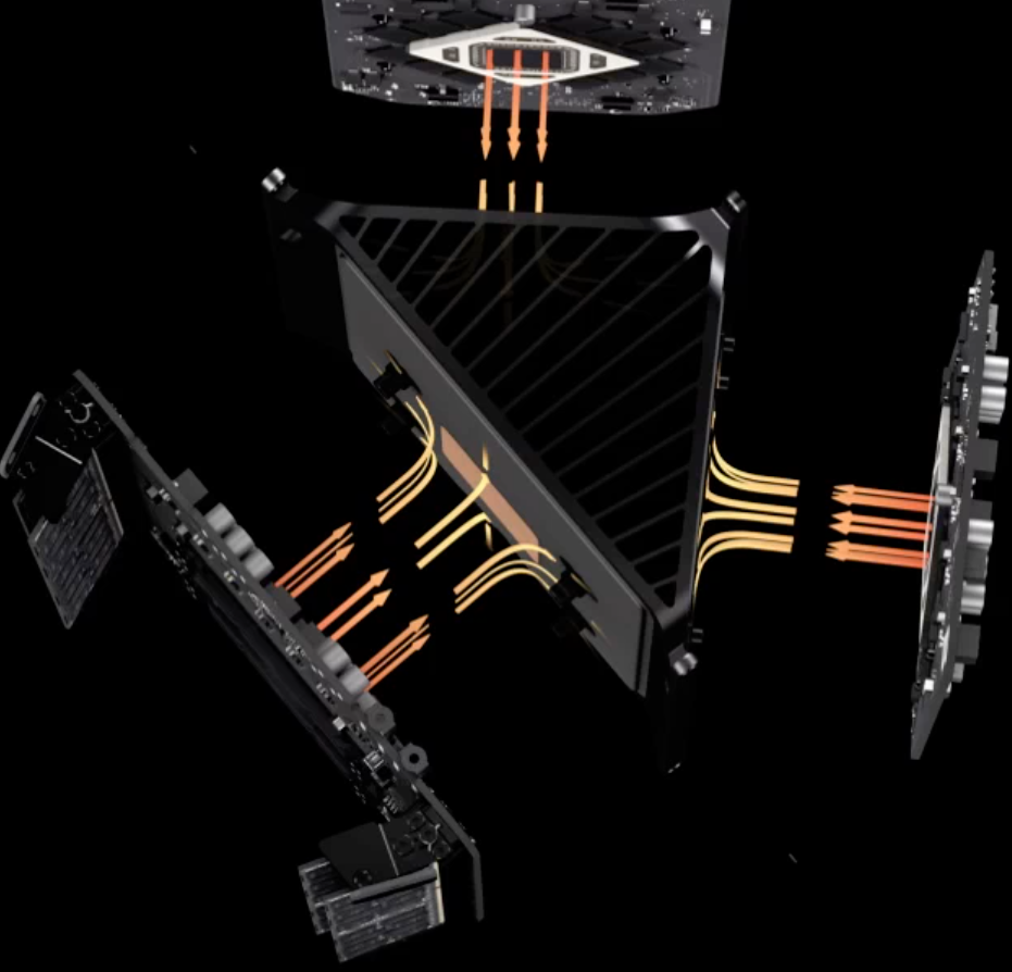 Slip off the shell, and the core of the Mac Pro actually has three corners. Apple has built it around an upright, triangular "thermal core" to which the mainboard and graphics are fixed: it works as one huge heatsink, with a single fan drawing cool air up from the vents on the bottom and out of the circular depression on the top.