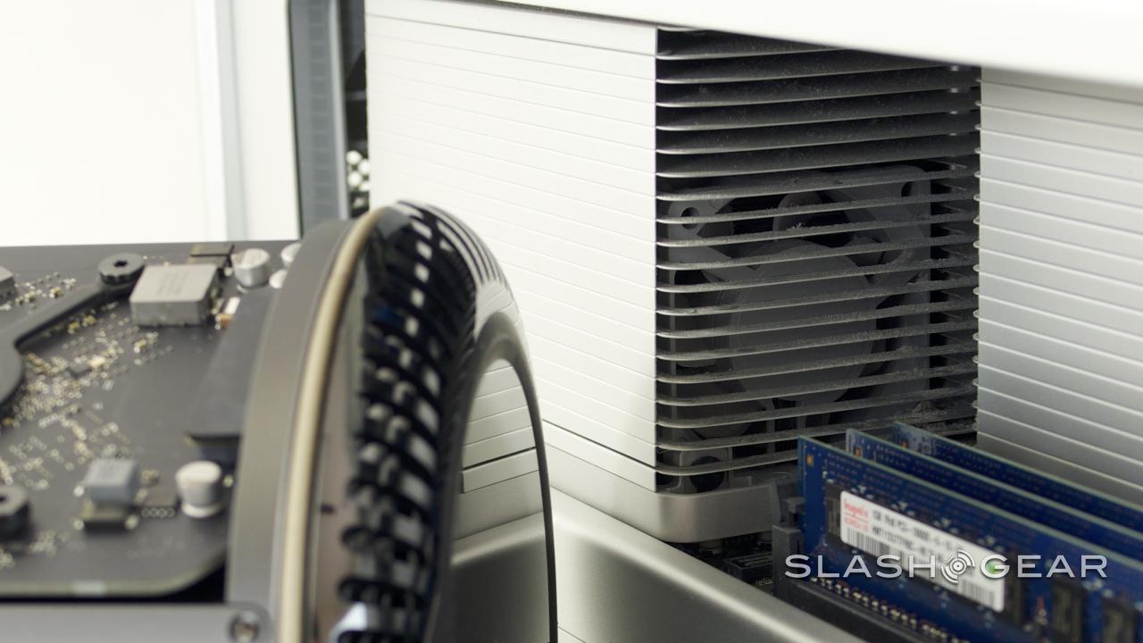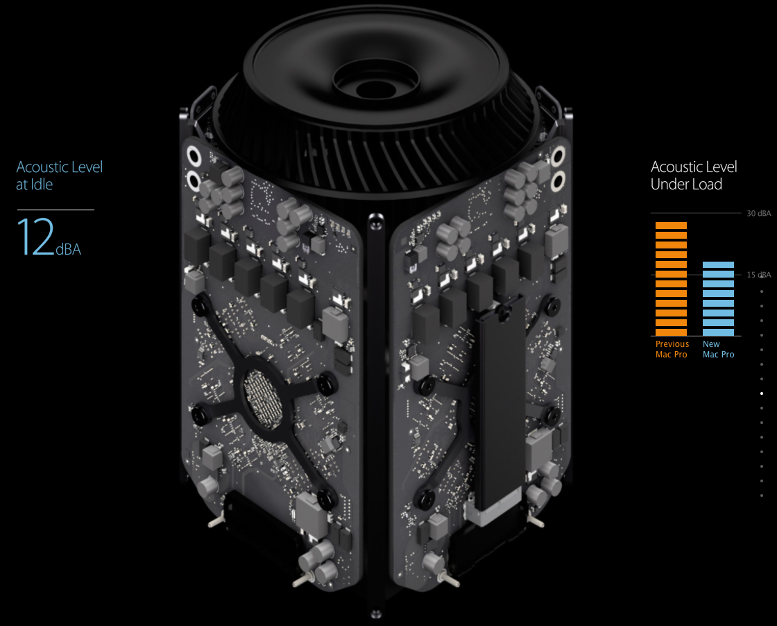 The previous Mac Pro used eight different fans in total, but Apple has simplified things considerably for the 2013 model. In fact, there's only one in the whole system, and it actually spins a little slower than the main fan on the old Pro. That's because the shape and the spacing of the blades have been adjusted to maximize efficiency while also minimizing noise; Apple says the new Mac Pro is up to 10 dBA quieter while crunching away than the workstation it replaces, while at idle it's as quiet as a Mac mini.