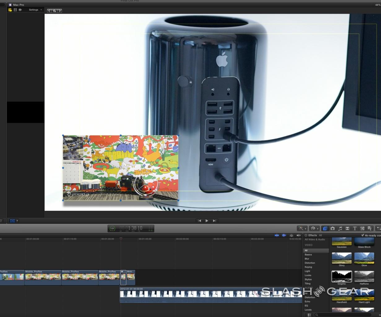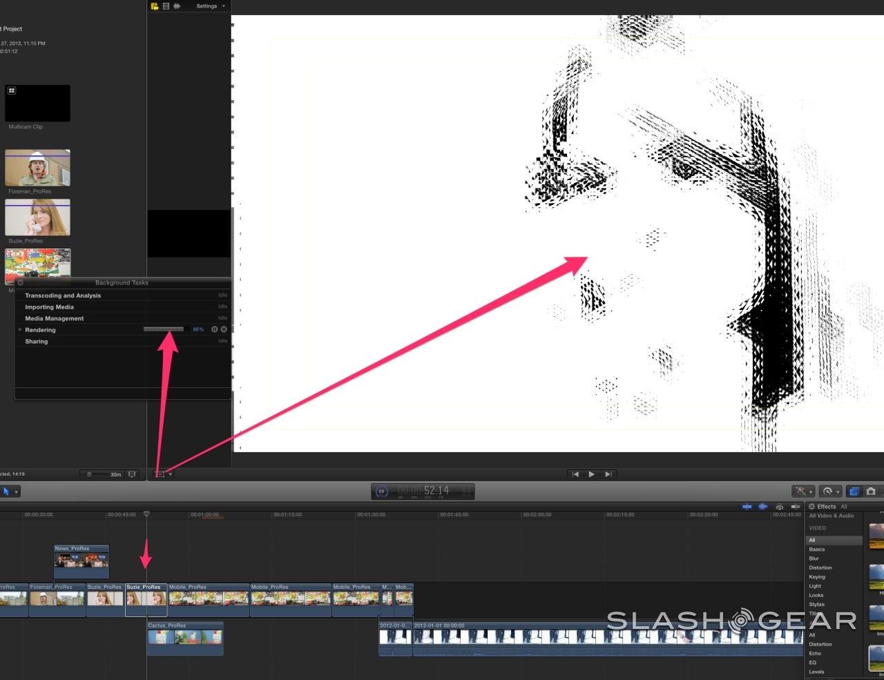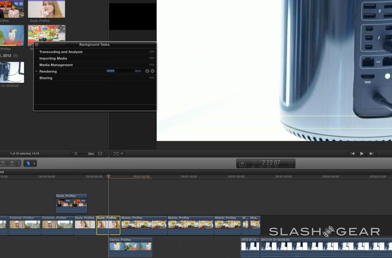 Poster-child for the 2013 Mac Pro, then, is Final Cut Pro X, updated this month to optimize for the dual GPUs on offer. The $299.99 video editing suite was already powerful, but it's with the dual-GPUs it has to play with here that it really flies.