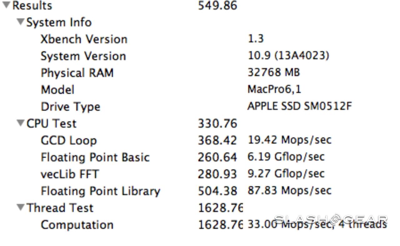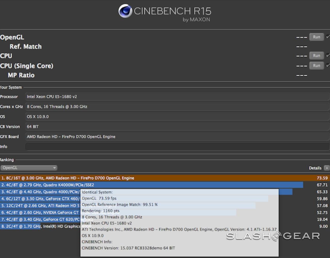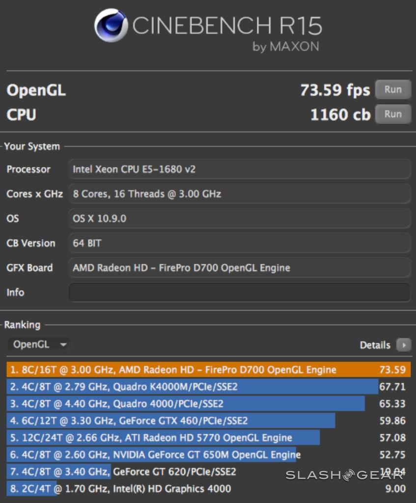 Our review unit has the 3.0 GHz 8-core Intel Xeon E5-1680v2 processor with 25MB of L3 cache, 32GB of 1866MHz DDR3 EEC memory (made up of four 8GB chips), and 512GB of PCIe flash storage. It also has the top-spec dual AMD FirePro D700 GPUs each with 6GB of GDDR5 VRAM. Overall, it's a $6,799 machine.