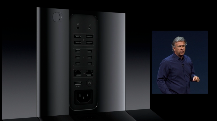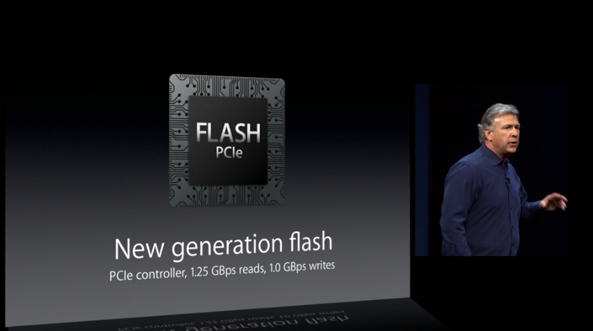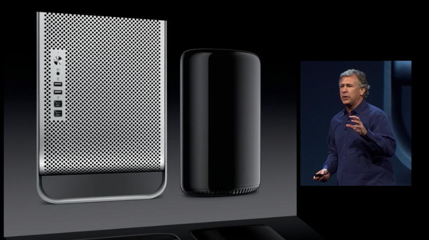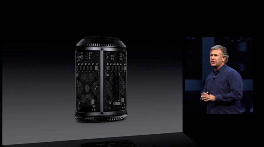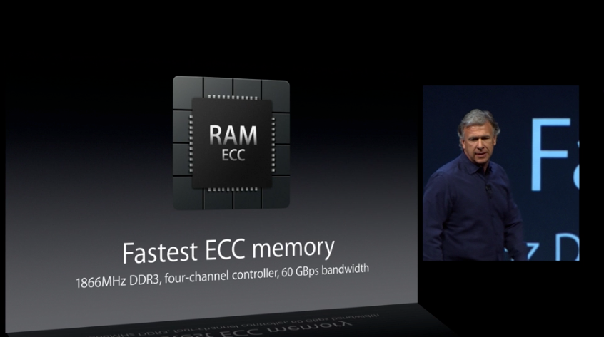 Inside, there's Intel's new 12-core, 256-bit Xeon processor keeping things moving. That's paired not with traditional hard-drives, but instead with flash storage; Apple is pretty excited about the type of flash, too, using a new-generation flash with a PCIe controller.