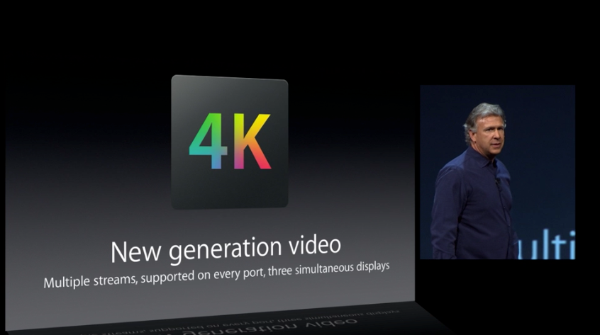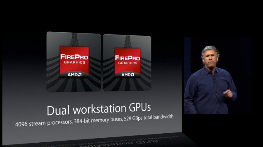 Graphics are taken car of with dual ATI FirePro workstation GPUs, with a total of 4096 stream processors. There's 384-bit memory buses for a total of 528 GBps of bandwidth. In fact, the new Mac Pro can support up to three simultaneous displays on every port, at up to 4K Ultra HD resolution.