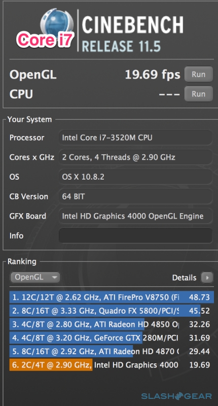 By way of comparison, the 15-inch MacBook Pro with Retina's NVIDIA GeForce GT 650M GPU saw it record a score of 34.30fps in the same category. The MacBook Air managed 16.41fps.