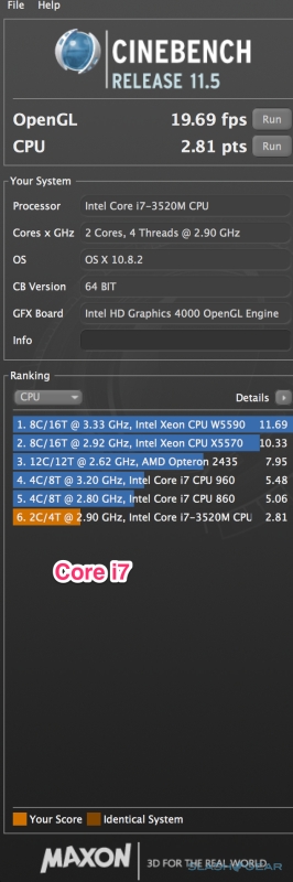 The Core i5 model scored 2.12 CPU points, while the Core i7 scored 2.81 CPU points, or roughly half the result you'd expect from a quadcore processor. Unsurprisingly, with no discrete GPU, graphics performance showed the biggest hit, with the Core i5 managing 14.81fps and the Core i7 squeezing out 19.69fps.