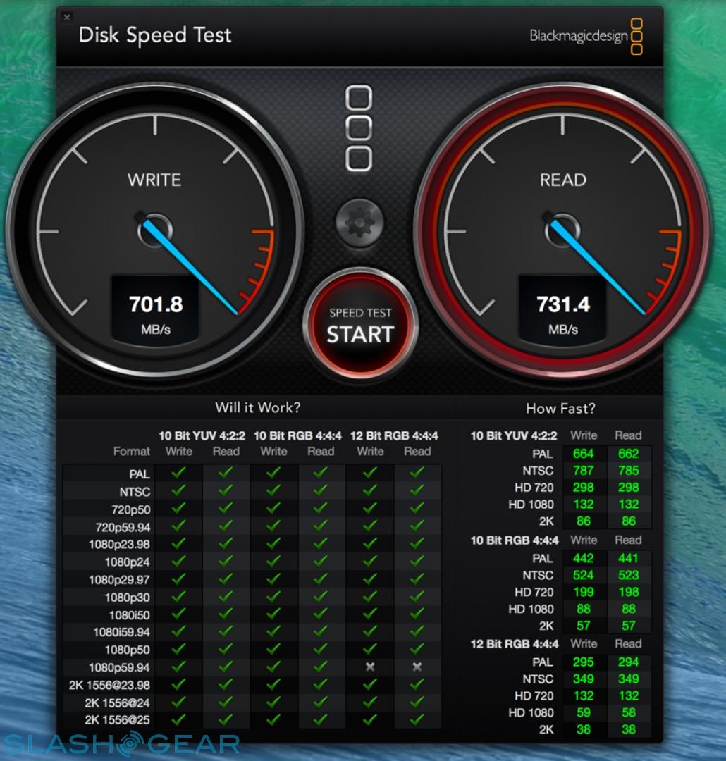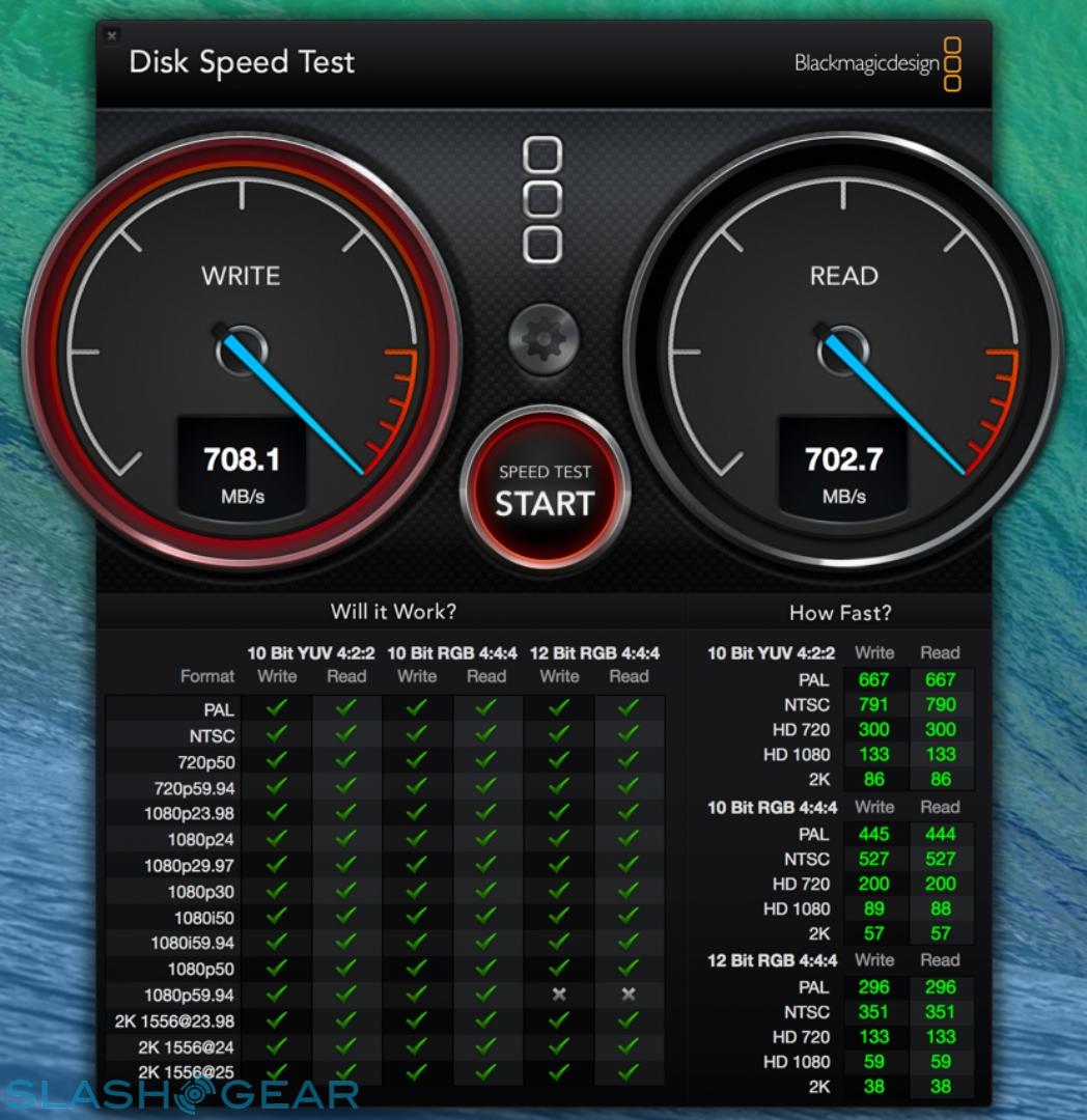 The most significant change is in storage performance, however. Apple's switch to faster, PCIe flash memory has seen a huge step up in throughput rates: where the 2012 Pro managed 306.6 MB/s write speeds and 448.0 MB/s read speeds in Blackmagic's Disk Speed test, the 2013 version comfortably extended its lead with write speeds of up to 708.1 MB/s and read speeds of 731.4 MB/s.