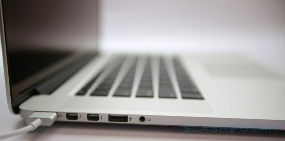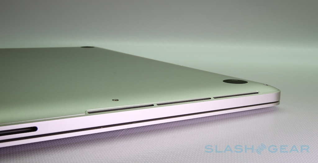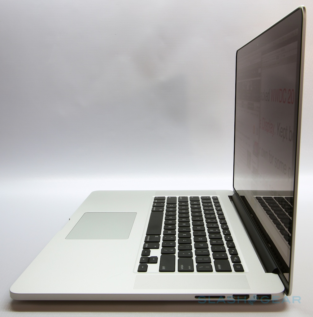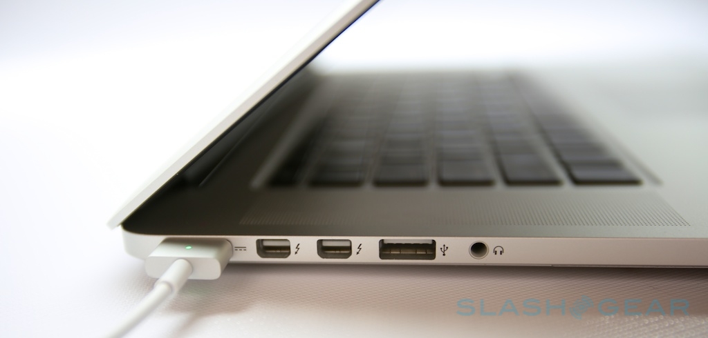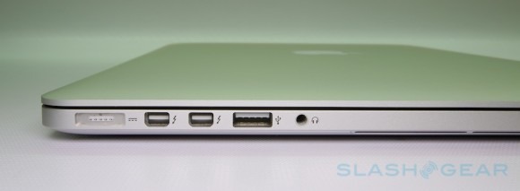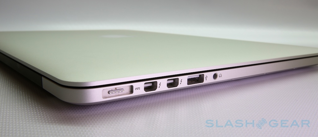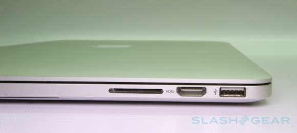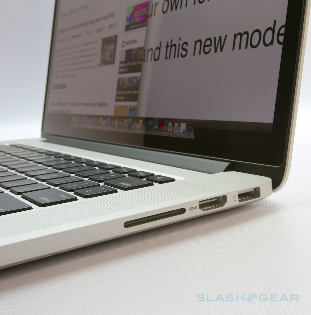 While it may look like a flatter Pro of old, Apple has in fact done some significant reworking to achieve the 4.46 pound notebook. Half of the ports – the two Thunderbolt, a USB 3.0 and the 3.5mm headphone socket, along with the redesigned MagSafe 2 connector – are on the left, while a second USB 3.0 along with HDMI and an SDXC card slot are on the right. Long-time Apple watchers will have noticed some unusual additions there, and indeed the MacBook Pro with Retina Display breaks some conventions.