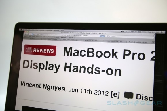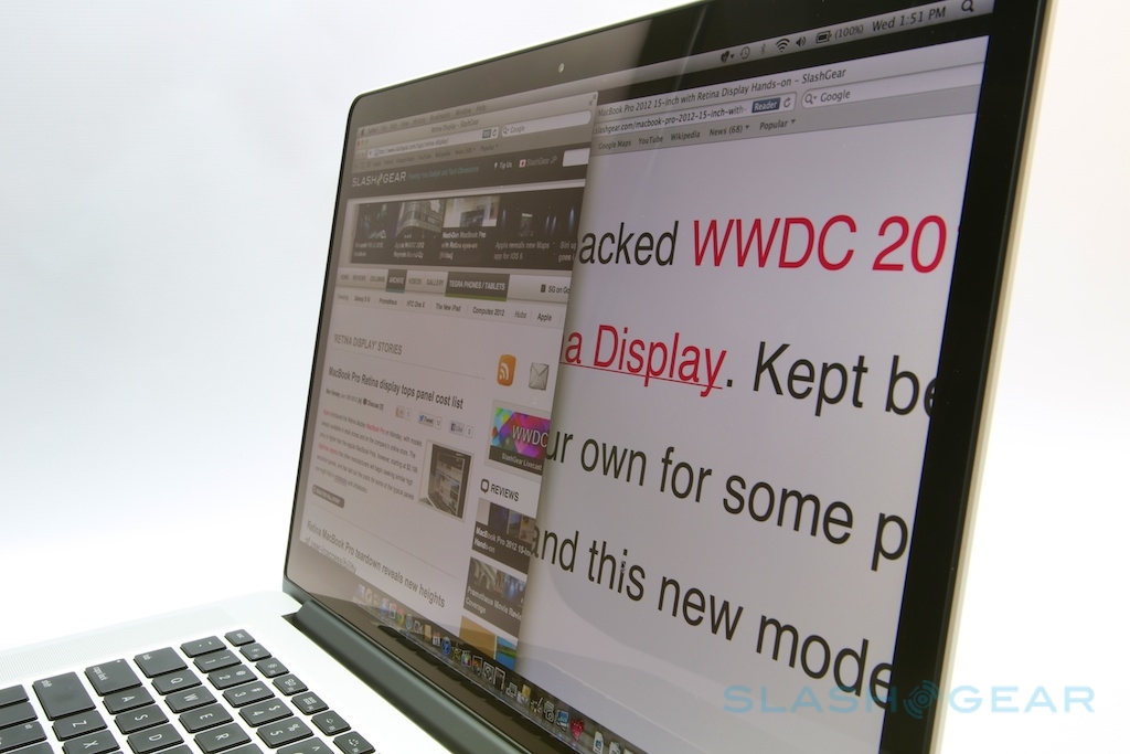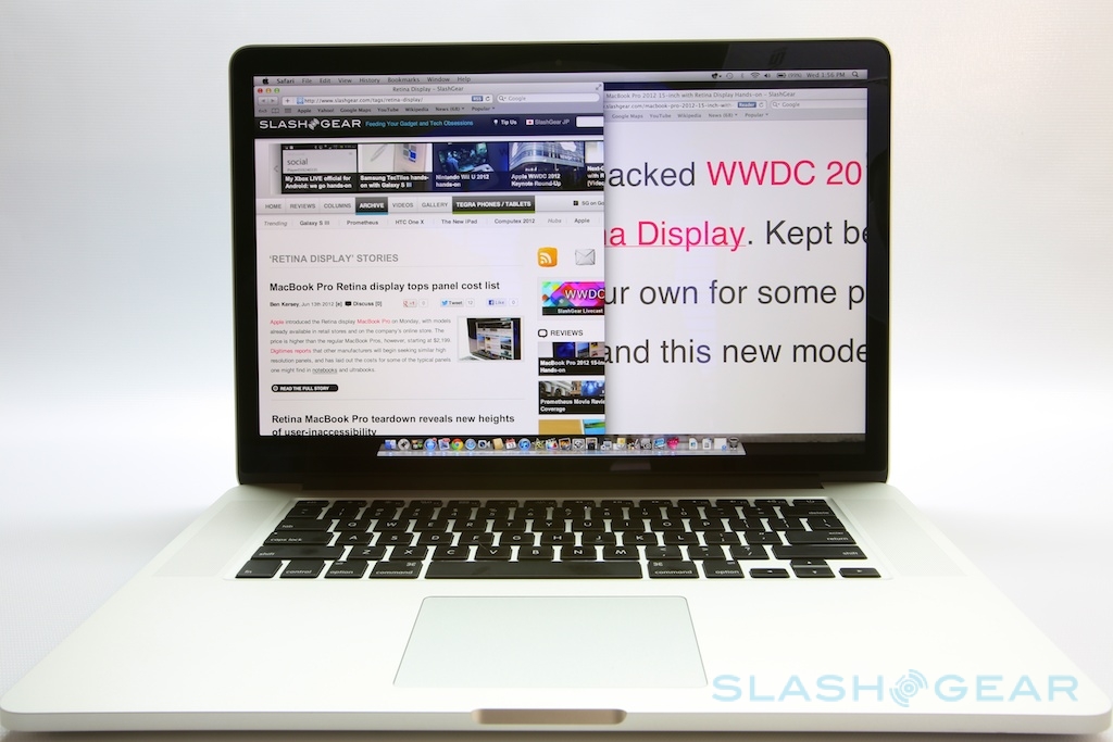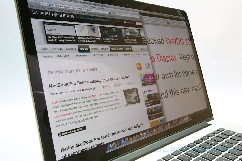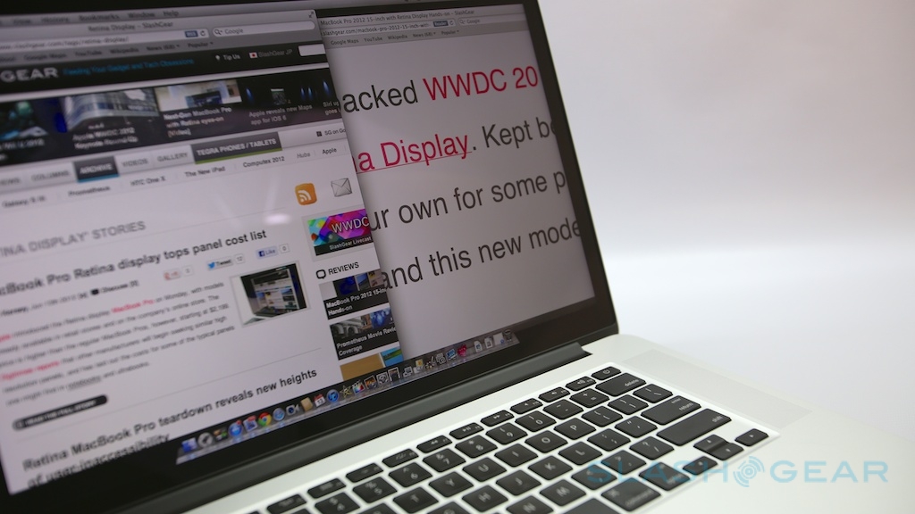 Make no mistake, the Retina Display of the new MacBook Pro is the notebook's pièce de résistance. Running at 2880 x 1800, it delivers four times the standard resolution of the previous Pro, and is finally capable of showing iOS developers a full-size preview of apps for the new iPad. Apple's "Retina" branding refers to whether the human eye is capable of individually-distinguishable pixels at a typical user-distance, hence this 221ppi panel getting the label while not matching the 264ppi of the new iPad or 326ppi of the iPhone 4S, each of which are expected to be held closer to your face.