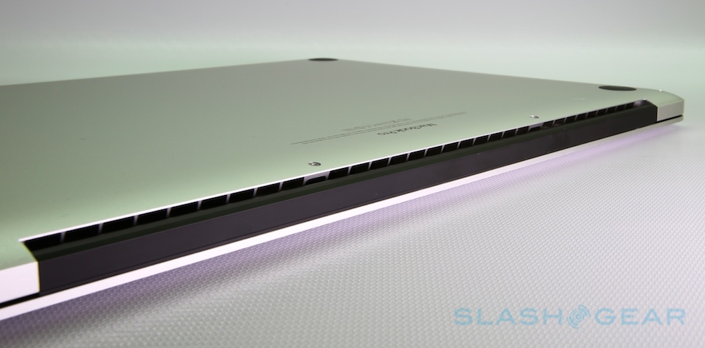 At first glance, then, it's familiar from the persistent design of the previous model (which stays on sale, of course, with updated Ivy Bridge processors and NVIDIA graphics). None of the Air's wedge-like taper, with new Pro instead resembling a flattened version of before. Both base section and lid have been trimmed to get the thickness down to 0.71-inches, with some casualties along the way.