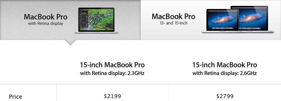 Just as with the old-style MacBook Pro, the new MacBook Pro with Retina Display has Intel's 3rd-gen Core i7 Ivy Bridge processors inside. There are two spec models, the entry level at $2,199 with a 2.3GHz quadcore (supporting up to 3.3GHz Turbo Boost and paired with 6MB of L3 cache) and a $2,799 version with a 2.6GHz quadcore (supporting up to 3.6GHz Turbo Boost and with 6MB of L3 cache). The latter can optionally be upgraded to a 2.7GHz quadcore (with 3.7GHz Turbo Boost and 8MB of L3 cache) for an extra $250.