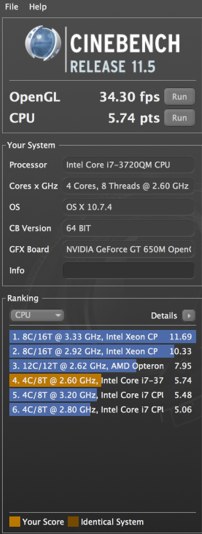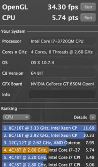 The new MacBook Pro scored 5.74 CPU points, putting it ahead of a last-gen 3.2GHz Core i7, and only really bested by eight- and twelve-core alternatives such as Intel's workstation-focused Xeon (as you'd find in the Mac Pro). It managed 34.30fps in OpenGL testing.