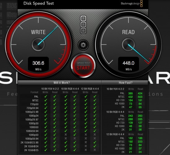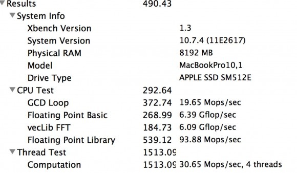 In a disk speed test of the new flash storage, the Pro managed 306.6 MB/s write speeds and 448.0 MB/s read speeds. Finally, in Xbench the new notebook scored 490.43 points.