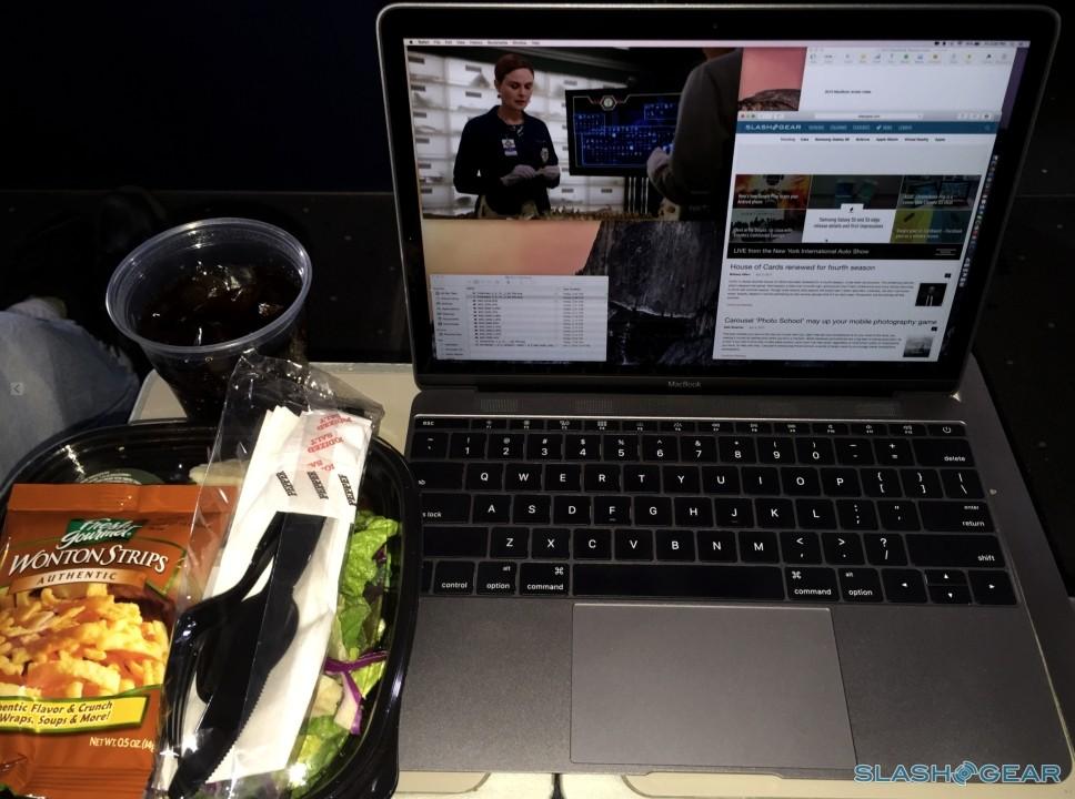 It may be Apple's new baby, but I wasn't going to coddle it. On a flight from New York City to Phoenix I used the MacBook for 5 hours 30 minutes with WiFi turned on, streaming audio to a Bluetooth headset, at default Retina resolution at mid-brightness, and still ended up with 31-percent – or an estimated 2 hours 3 minutes – left. During that time, I watched around three hours of video using iTunes and VLC, browsed the web in Chrome, used Pages to write, caught up with a little email in Mail, and chatted in iMessage and Slack.