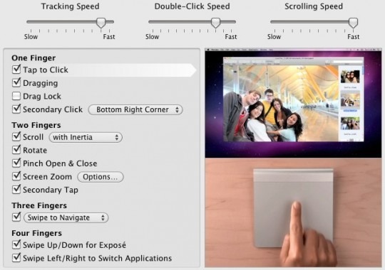 The gestures themselves should be familiar to most Mac users. By default, two fingers are used to scroll, with all directions supported, while three fingers swipes back and forth through pages. A chiral-rotate gesture flips image orientation around, while pinch-zooming is also supported. Four fingers, meanwhile, trigger Exposé when swiped up or down, or switch applications when swiped left and right. Thanks to the new settings pane, however, you can selectively shut off certain gestures if you don't use them, adjust tracking, double-click and scrolling speed (including optional inertia), and change the behavior of three-finger use. Rather than flipping pages, you can set it to drag windows around the screen (a new software update adds the same optional functionality to MacBook trackpads).