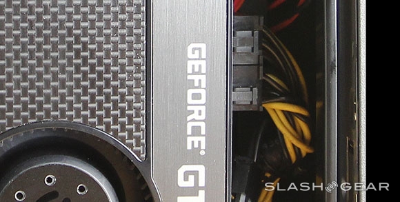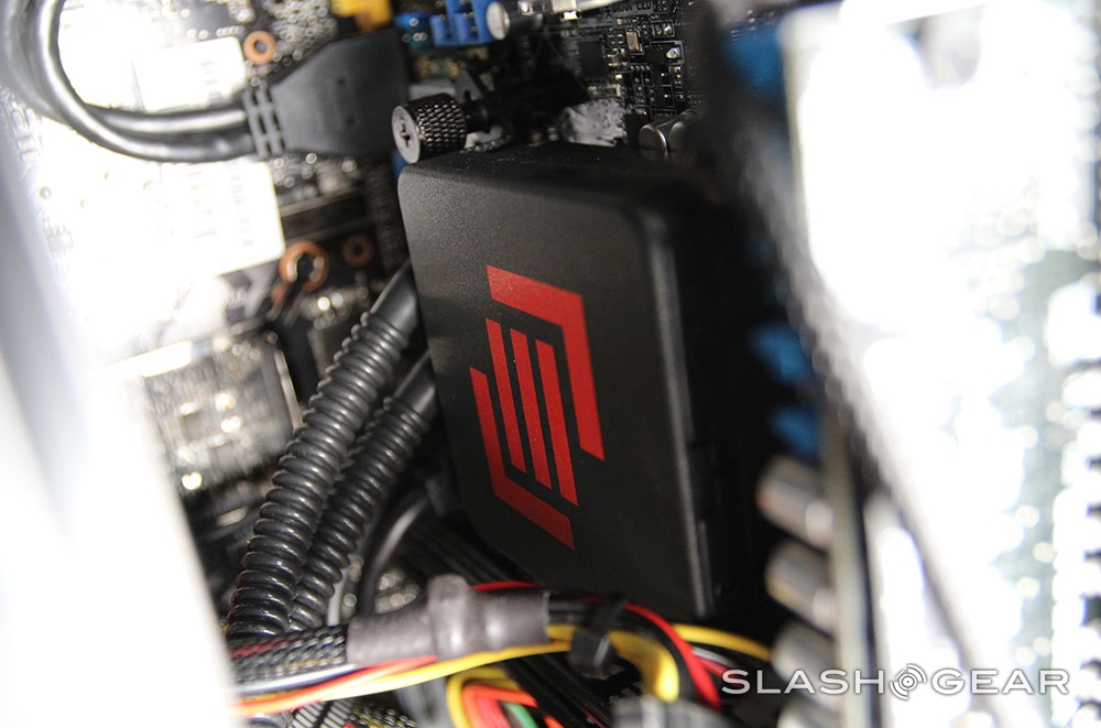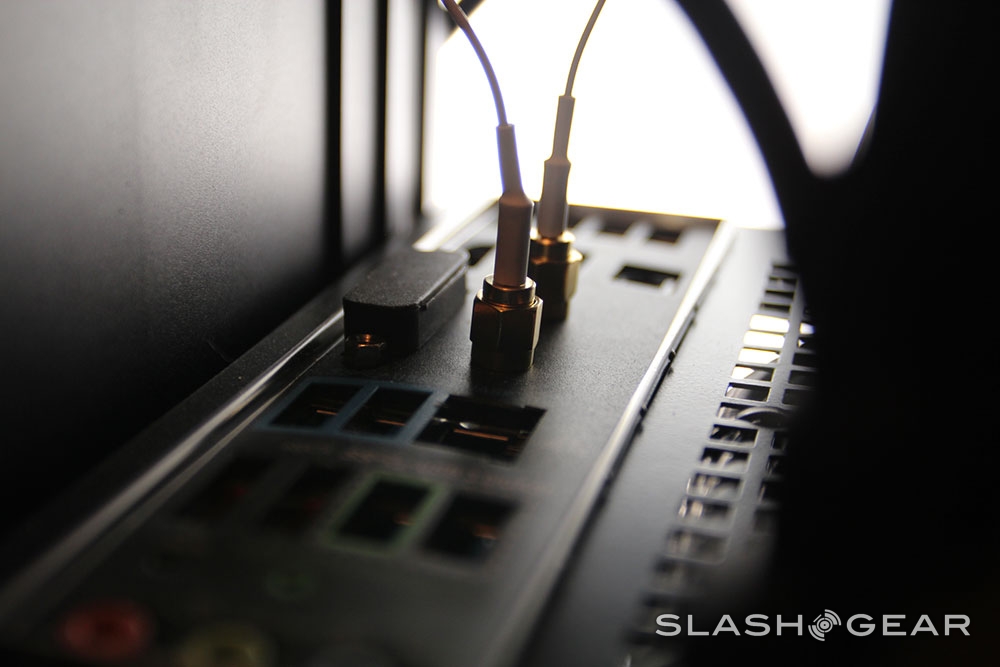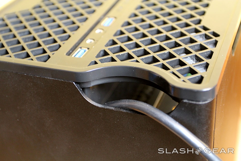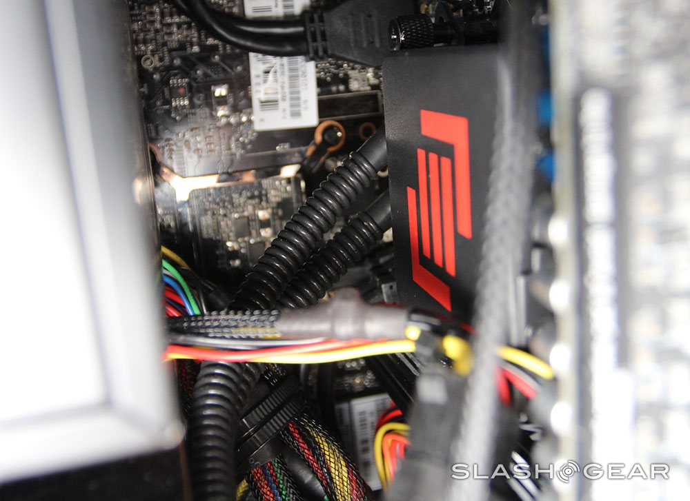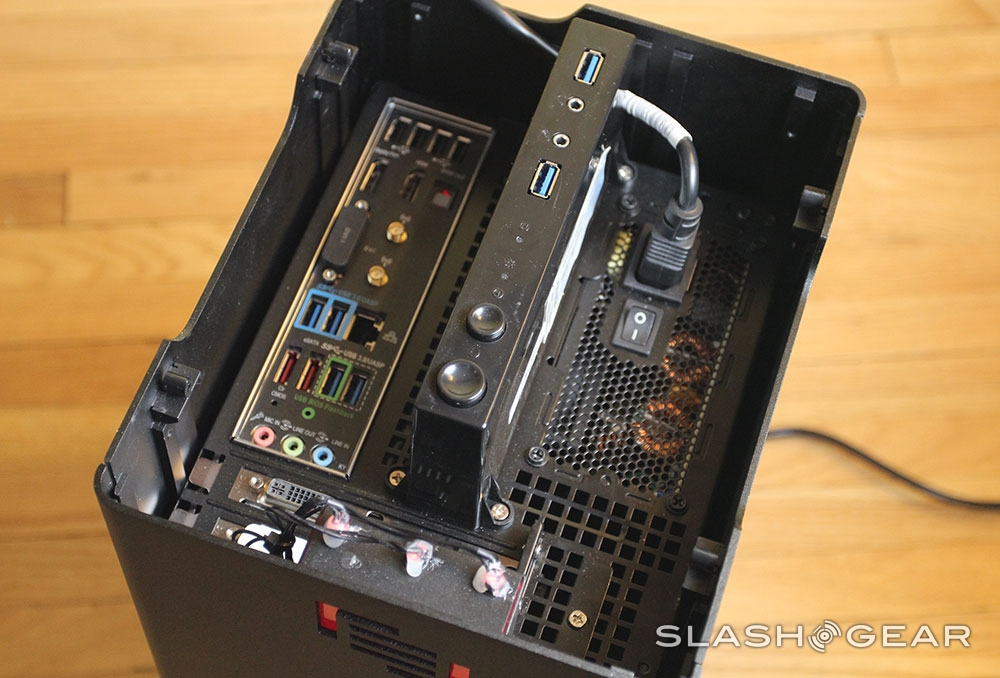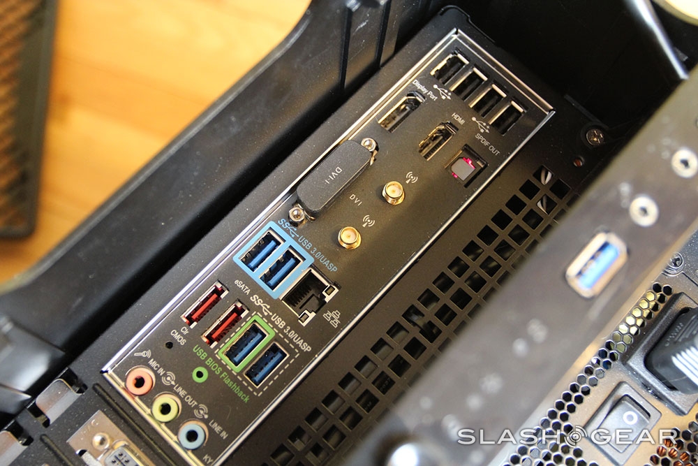 Besides the riser you've got a collection of ports of all kinds: a couple more USB 3.0 ports, four USB 2.0 ports, jacks for Wi-fi antennas, Ethernet, and a couple of powered e-SATA/USB ports. These sit near HDMI, DVI, and DisplayPort connections all ready for action. All of this is hidden if you wish it to be, but when you're making with the massive amount of connections at once, you'll have an octopus of wires attacking your desk. This isn't any different from the rest of the desktops out there, of course, but the one-ness of the system without cords can be deceivingly clean looking – you might just want to put the system up on its own on your desk just for the light. It looks that good.