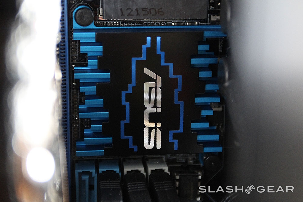 We've also got a 30GB Corsair Accelerator SSD Caching Drive, 500GB Seagate 7200rpm hard drive with 16GB Cache SATA, and up front is an 8X Dual Layer DVD RW Drive Slot Loading SATA so you can watch Lord of the Rings – or whatever you do with a DVD drive these days. The motherboard here is made by ASUS, the P8Z77-I Deluxe with Lucid Virtu MVP and those lovely USB 3.0 ports next to SATA 6G, Bluetooth, and wi-fi connections.