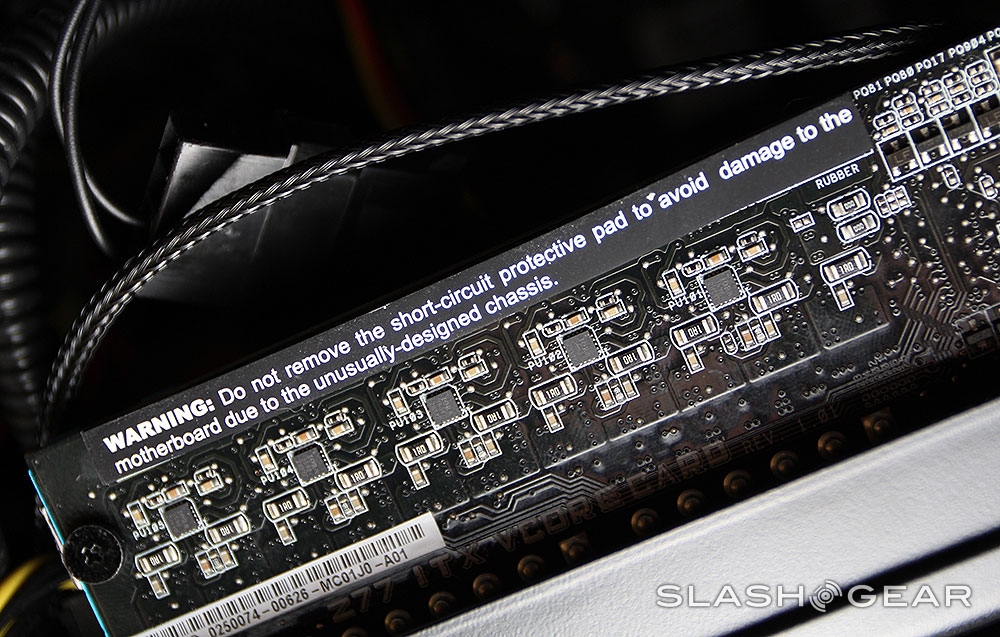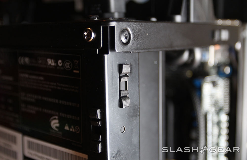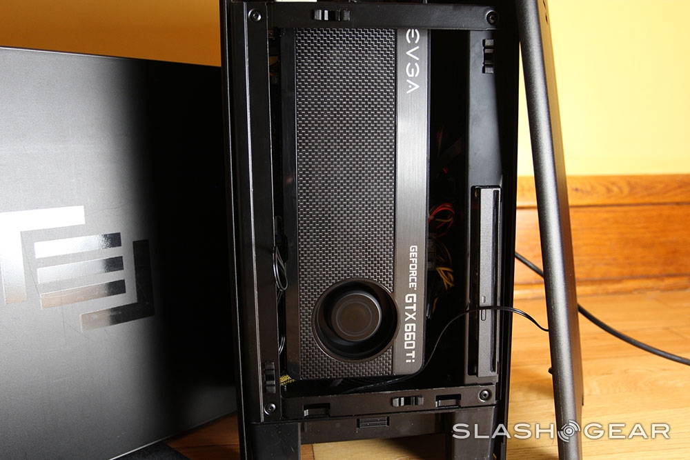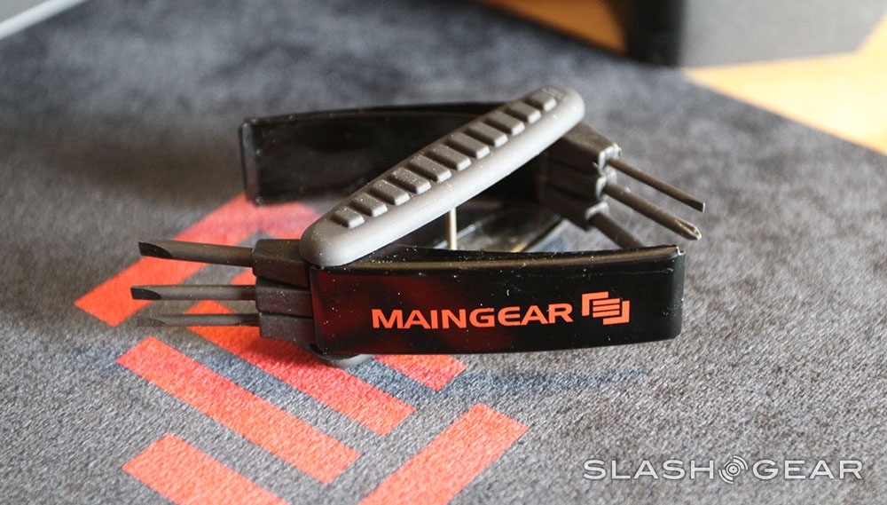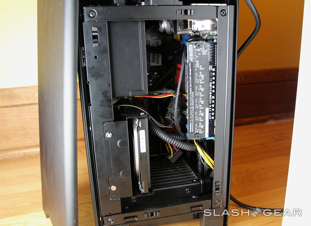 The front and the back of the setup here are easy to remove as the top with pressure-clips holding them in place until you make the effort to pop them off. Inside you'll find your hard drive and graphics card ready to look at, admire, or replace at will. Everything else is locked in tight – but if you REALLY want to un-do the precision construction here, there's a multi-tool included in the box.
