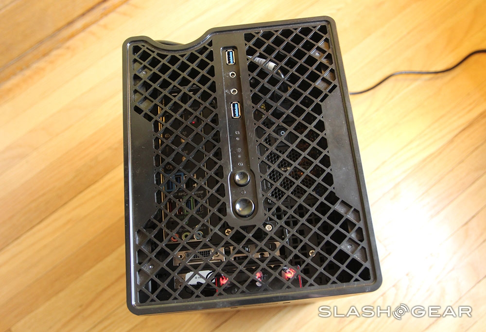 One you get past admiring the free MAINGEAR t-shirt you've likely gotten in the package, you'll be having another peek at what's under the grill up top. Here you'll find a riser cutting the array in half, with a space for the power cord to find its way up and out the back area and the power and reset buttons to stay high. This riser also has the headphone and mic ports popping out the top along with two USB 3.0 ports. All of this sneaks its way out through the top grille when its closed down tight.