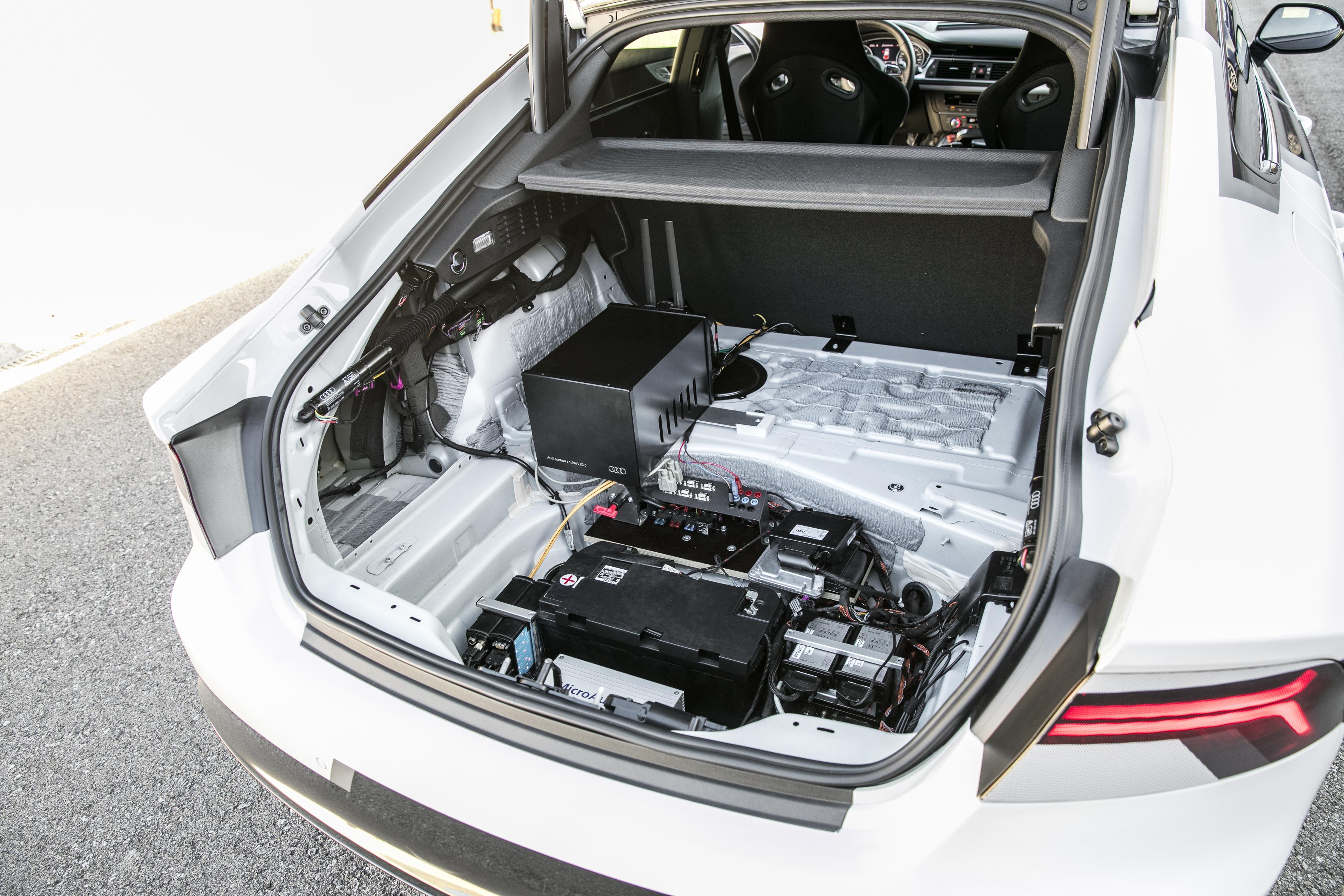 Now take all of the aforementioned tech and toss it out the window. Well, almost everything: as far as weight goes, Audi tried to get Robby's heft down as close to the production model as possible. In order to do that, they ripped out Robby's redundant systems such as the set of stereoscopic cameras and the secondary brake booster controls, as well as all the extra computing hardware in the trunk. For safety, as you can see in the video, there's now a trained Audi driver behind the wheel, holding a controller with his thumb firmly pressing a dead-man's switch. The moment something goes south, releasing the button also releases control to the driver.