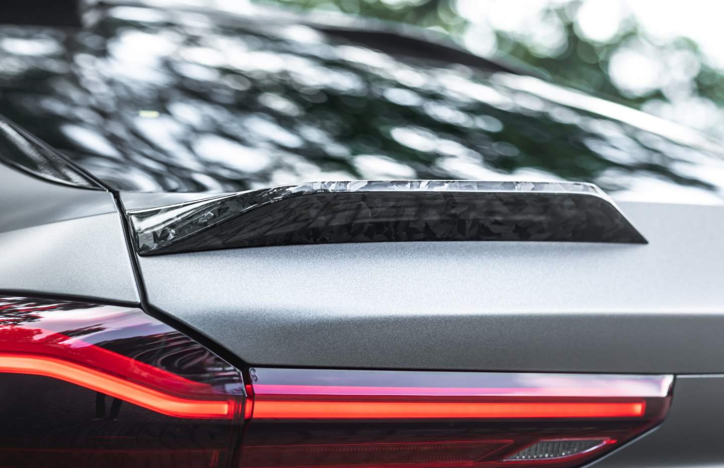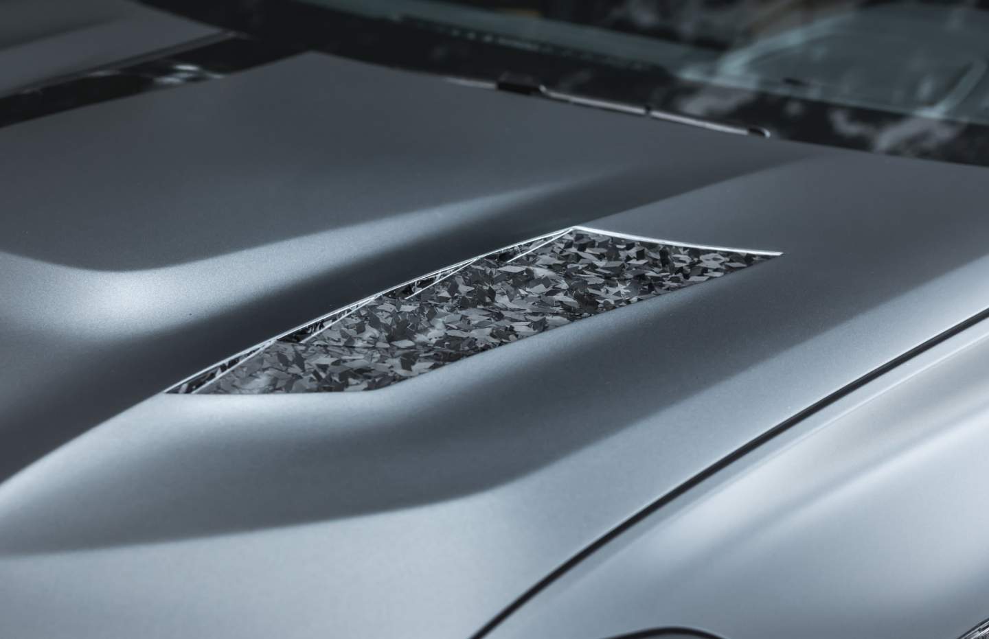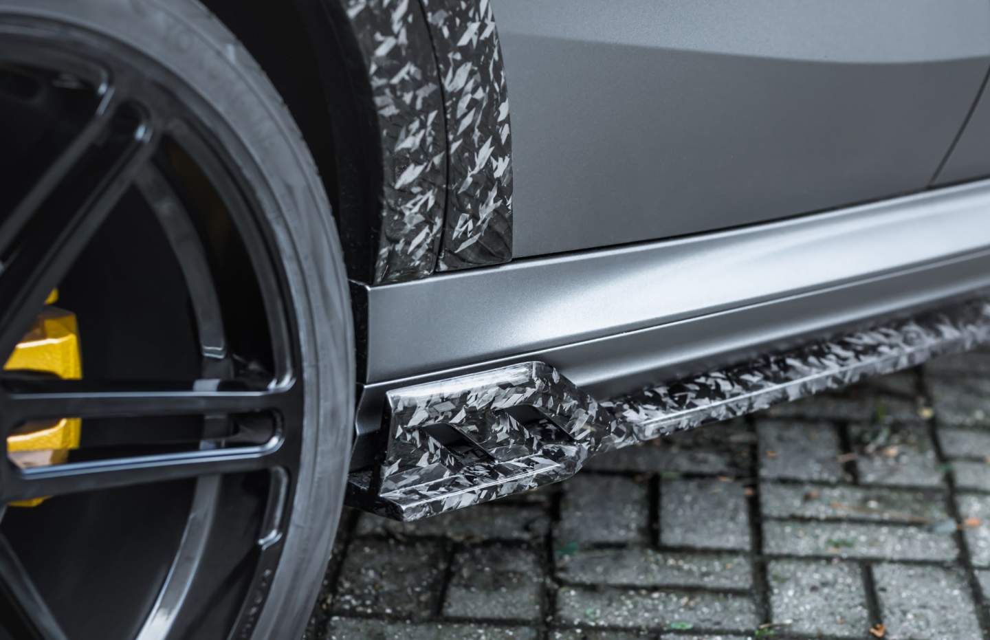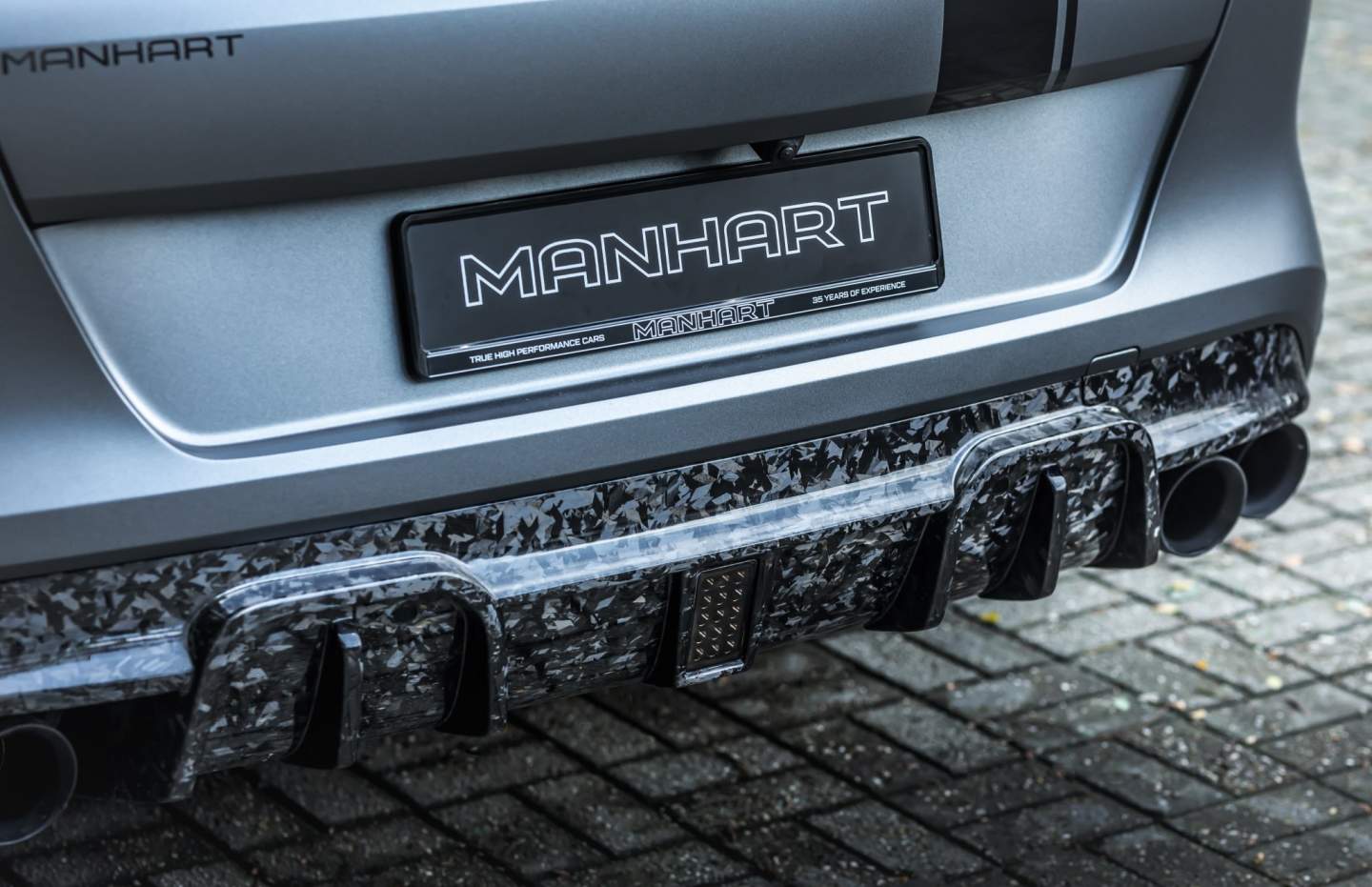 See those marble-like protrusions on the fenders and around the vehicle? Those are what Manhart calls "artistic forged carbon," and they're everywhere! According to Manhart, the irregular fiber structures have the look of polished granite or marble. You can find it on the wing mirrors, front spoiler, front grille, side skirts, wing extensions, and rear diffuser. Even the multi-part wing extensions, two-part rear spoiler, and hood are from the same forged carbon material.