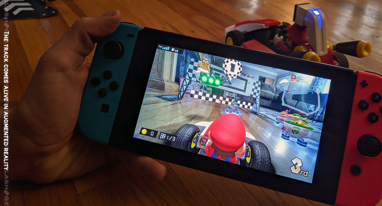 The game plants racers in your at-home track, and has you lay the track down in-game before the race begins. The Kart's camera sees its environment and shows said environment to the Switch, where the augmented reality of the situation unfolds.