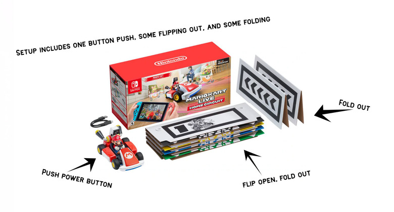 Setup includes unfolding four cardboard and plastic checkpoints and two cardboard arrow cards. We needed to remove the Mario Kart from the box and press the power button (or ignition, if you prefer), and connect said Kart to a Nintendo Switch with a QR code.