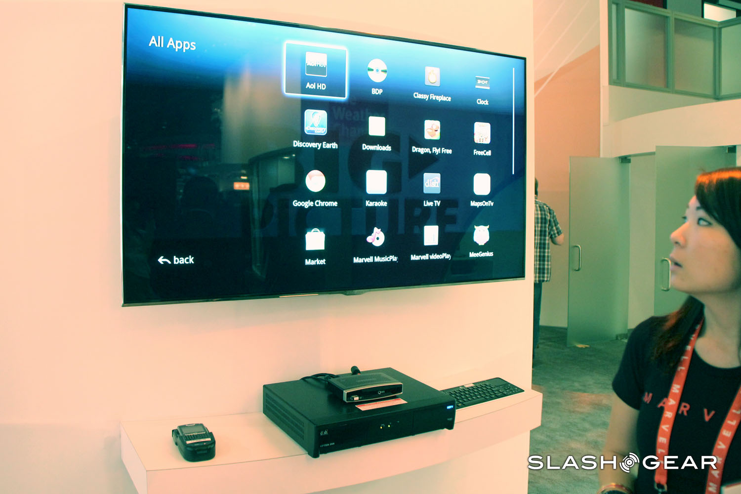 Google announced a major shift for its Google TV last week: a shift to the same ARM-based architecture that runs Android smartphones and tablets. The first partner to jump on board is chip maker Marvell. Their new Armada platform is an integrated ARM solution that it will deliver to OEM partners to include in set-top boxes and all-in-one Google TV televisions. They were showing off the new Armada system at CES, and we snuck in to get a look.
