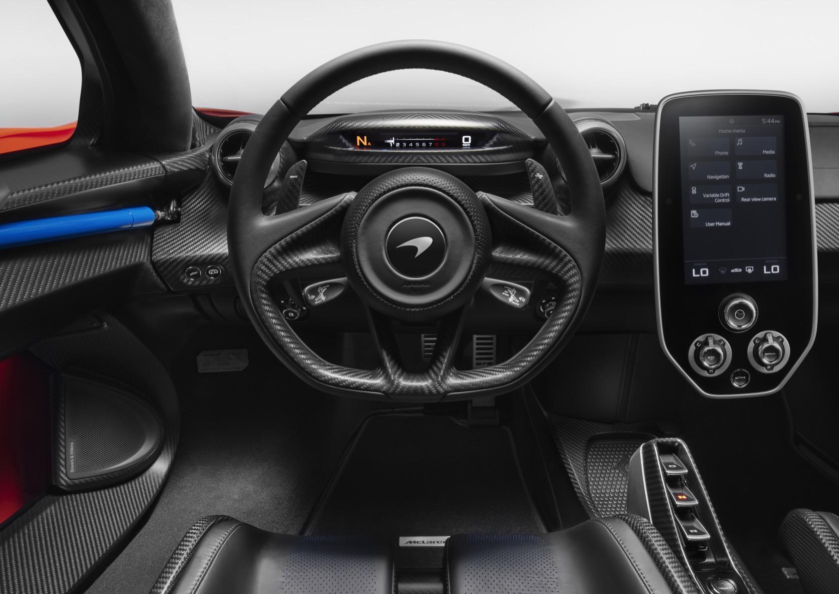 Most of the other controls are handled by the big touchscreen display in the center console. McLaren's rotating Folding Driver Display, which hinges down to show the basics of speed, engine speed, and gear, is also borrowed from the 720S. What you won't find is any significant storage space: there's room for a couple of helmets and race suits behind the seats, but everything else you'll have to leave at home.