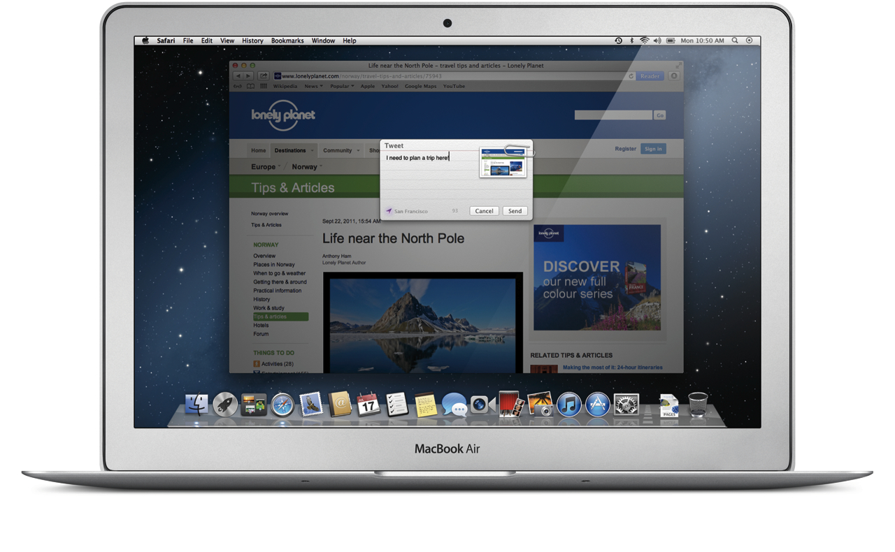 There's also flexibility depending on what you're trying to share. Click the Share button in Safari, for instance, and you can email either a plain URL, the full webpage, or the Reader version with the URL and slimmed-down text. Quick Look and Preview also identify what content you're viewing and filter the sharing options accordingly.