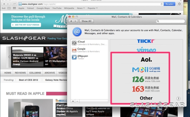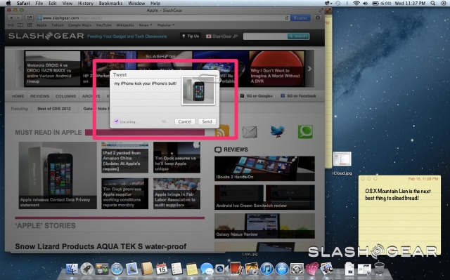 Although Twitter is just one of the Share Sheet options, it's the third-party service which is most consistently integrated with Mountain Lion. Like in iOS 5, once you log in for the first time you can tweet content across Safari, Preview, Photo Booth and Quick Look, among others, in addition to seeing responses and direct messages in the Notification Center (though not in the initial beta).
