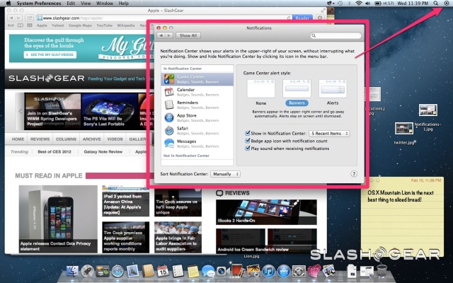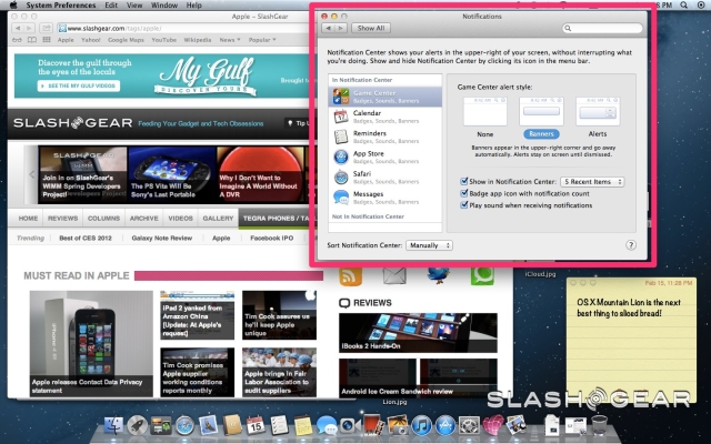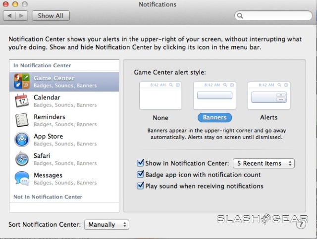Many OS X users rely on third-party app Growl to keep them up to date with what's going on around their Mac: now, Apple has brought the Notification Center from iOS over the Mountain Lion. Two types of notifications are offered, both appearing in the upper right corner of the screen. Banners are temporary, showing for five seconds and then sliding away, while Alerts are persistent, giving you the choice of either closing them manually or clicking "Show" to go to the app itself.