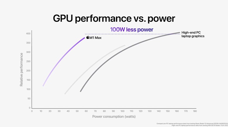 The M1 Max GPU, meanwhile, uses 40-percent less power compared to a Razer Blade 15 Advanced's GPU, or 100W less power than a MSI GE76 performance laptop. The latter typically requires 160+ watts to sustain maximum GPU performance, Apple says. Unplug them both, and the M1 Max delivers 3.3x the GPU performance.