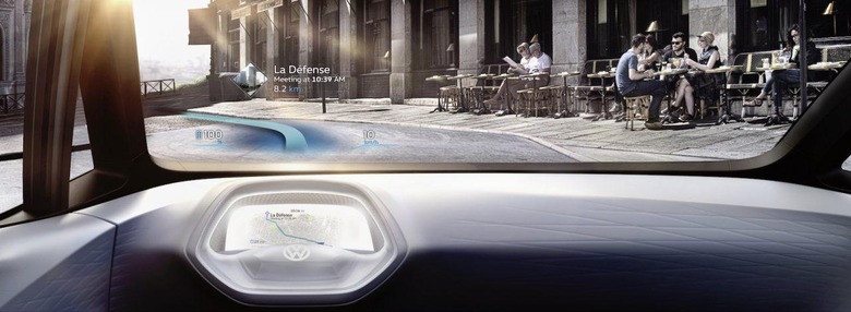 The steering wheel – which retracts when the I.D. is in autonomous or "I.D. Pilot" mode – has the transmission controls in the center, along with capacitive buttons for turn signals and infotainment control. There's a head-up display with an augmented reality interface, overlaying navigation arrows atop the roads and lanes they refer to, plus a 10-inch display showing all areas of the car's systems.