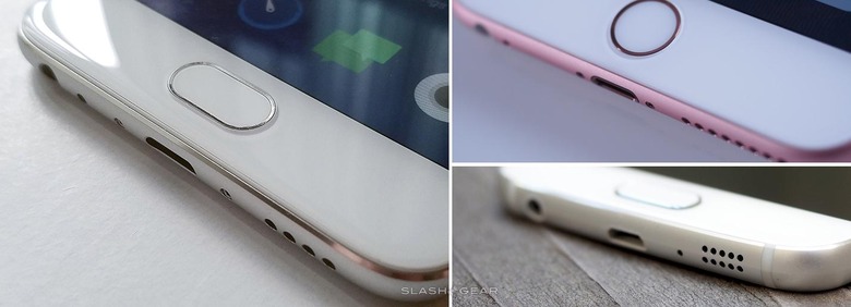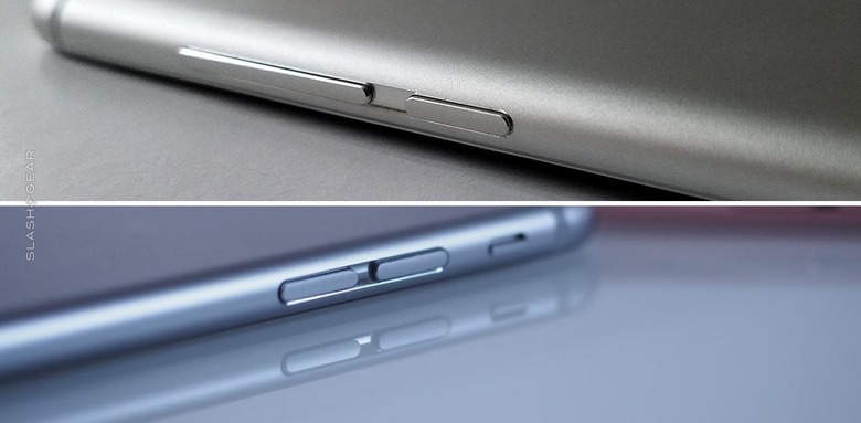 The volume button sits on the right side of the phone right near the power button and exists as a rocker rather than two separate buttons. Both the Galaxy S6 (and 7) and iPhone 6 (and 6S) have their separate volume buttons on the left.