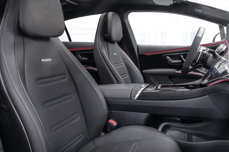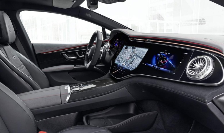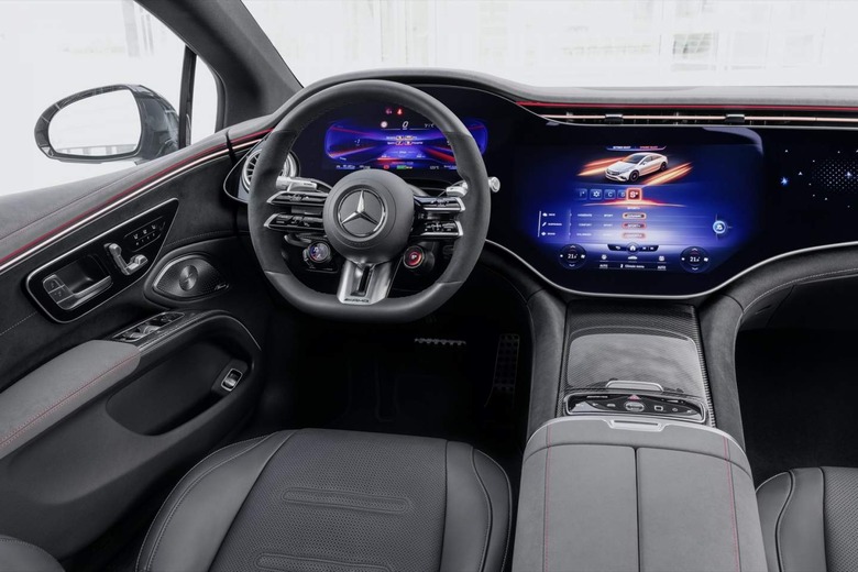 Inside, the MBUX Hyperscreen will be standard, spanning the dashboard with displays. There'll be custom AMG graphics, along with the AMG DYNAMIC PLUS package as standard. That has different audio for the EV, among other things, with adjustable levels.