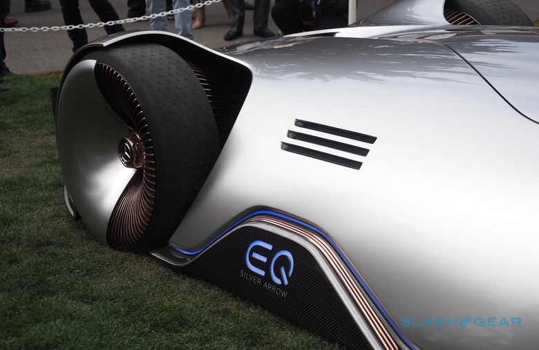 5.3 meters long, the EQ Silver Arrow promises even more speed. The carbon fiber body's style is Flash Gordon meets Cylon warrior, with sinuous curves flowing around the wheels yet leaving plenty of gaps through which the custom Pirelli rubber – with its unique star embossing – can be viewed.