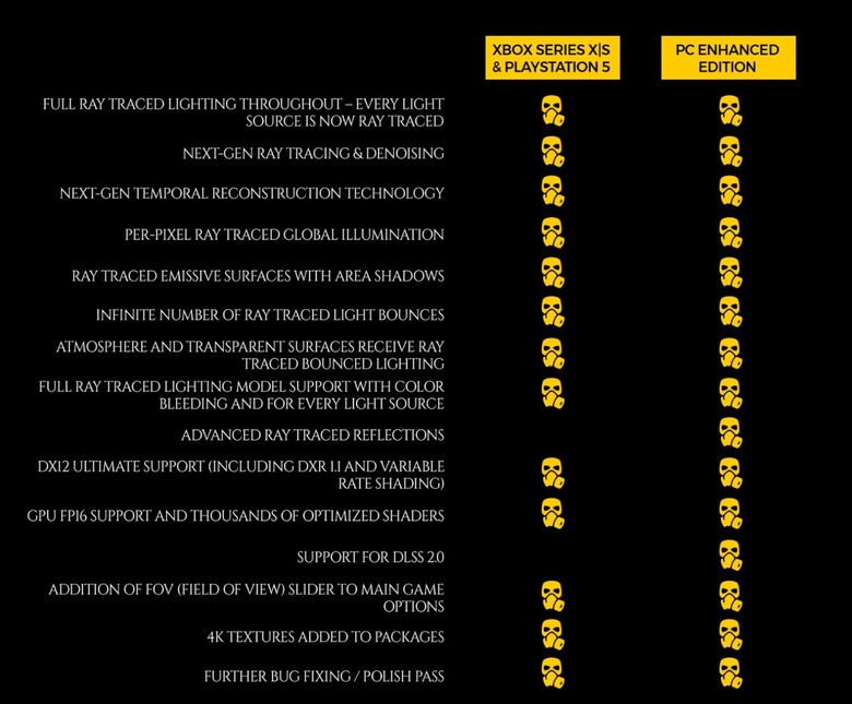 As for what's changing in the next-gen version of Metro Exodus, the developers have put together the handy table you see below. It even compares the Xbox Series X and PS5 version features to the PC Enhanced Edition that shipped out last month, and it seems that the only things the current-gen console versions are lacking are advanced ray-traced reflections and support for DLSS 2.0 (which makes sense). 4A Games has also put together a lengthy technical analysis of the Xbox Series X and PS5 versions that goes into great detail about the changes that were made.