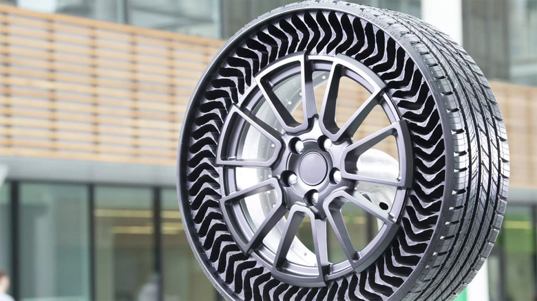 Airless tires have been around for a long time on industrial machinery like forklifts and other devices. However, those tires haven't been available for passenger vehicles until now. Michelin is showing off a new airless tire that relies on rubber "c" shapes underneath the tread in the area where air would normally help the tire maintain pressure. Anyone who's ever had a flat tire can immediately see the benefit of the Uptis tire; no air means no leaks and no flats.