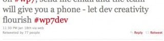 "#geohot if you want to build cool stuff on #wp7, send me email and the team will give you a phone – let dev creativity flourish #wp7dev" Brandon Watson