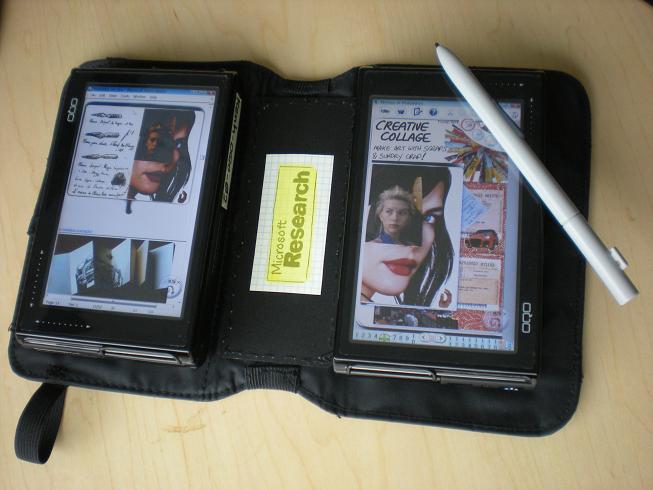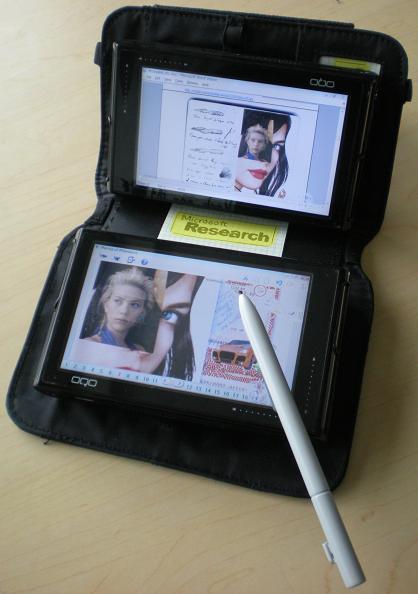 Ken Hinckley, of Microsoft Research, has been working on a dual-touchscreen multi-tasking prototype called Codex, taking two of OQO's Model 2 UMPCs and using intelligent software to manage how information is spread between the displays. Rather than manually positioning different windows on a single large screen, Ken's concept recognizes that, say, reference and in-progress documents are more appropriately separated for efficiency; it can therefore automatically adjust them to fit the two touchscreens.