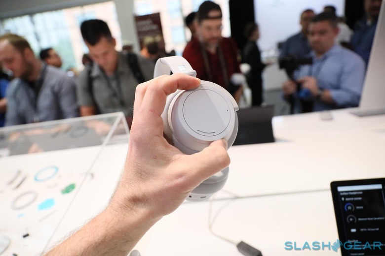 The Microsoft Surface Headphones are over-ear headphones. Noise cancellation can be adjusted at the side of one of the phones with a dial – the dial is integrated into the side of the device. There's another dial on the other device that'll perform additional adjustments, and both phones have their own ports and/or buttons – have a peek and see. Microsoft showed a splayed-out look at the headphones' innards, too – see if you can spot the battery size!