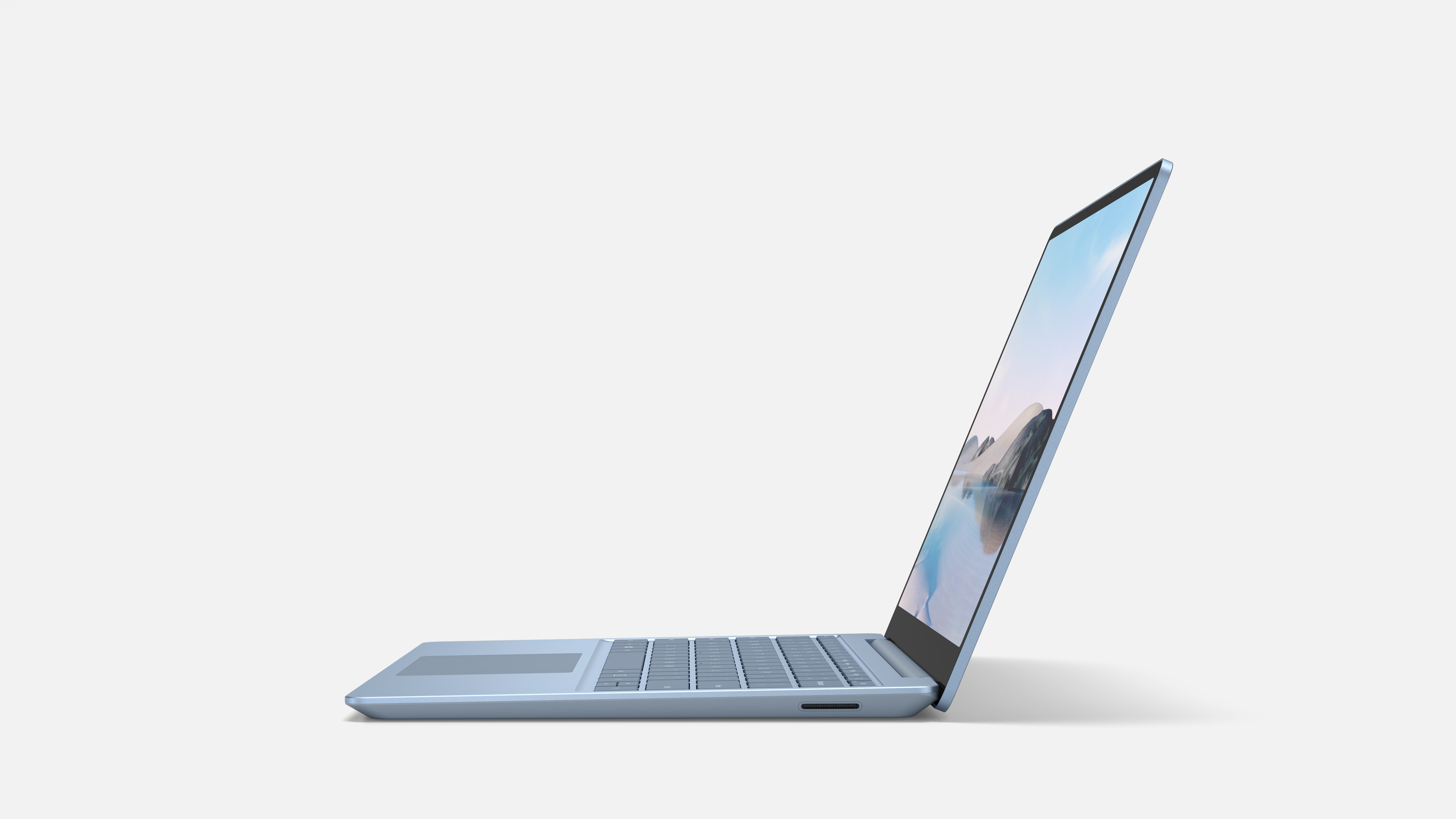 Where the Surface Laptop is all-metal, the Surface Laptop Go uses aluminum for its top but then a polycarbonate composite resin for the base. That combines glass fiber and 30-percent post-consumer recycled content. The whole thing measures 10.95 x 8.1 x 0.62 inches and tips the scales at 2.45 pounds, and Microsoft will offer the notebook in Ice Blue, Sandstone, and Platinum finishes.
