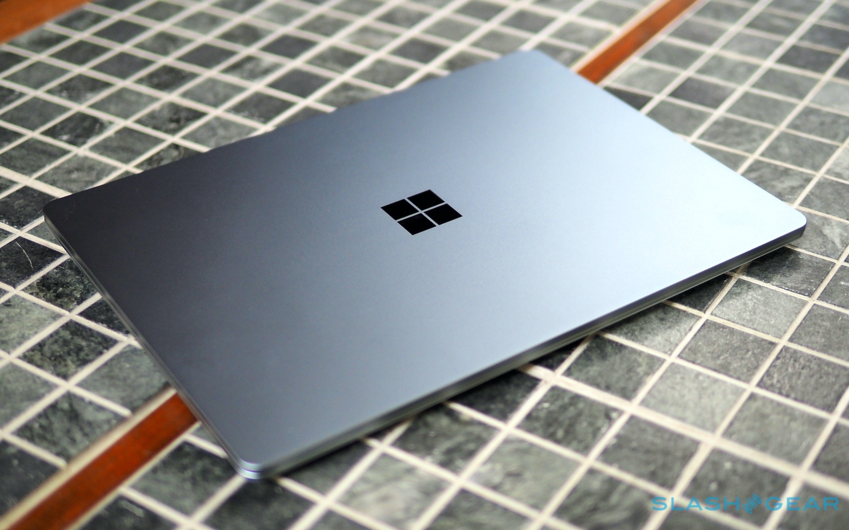 The Surface family resemblance is clear, though with concessions to price. Microsoft uses aluminum for the top, in a choice of Sandstone, Platinum, or this fetching Ice Blue finishes. The bottom, though, is a polycarbonate composite resin, with the feel of soft-touch plastic. For the most part it doesn't come across as cheap, though the flex under the hinge when you squeeze it isn't entirely reassuring.