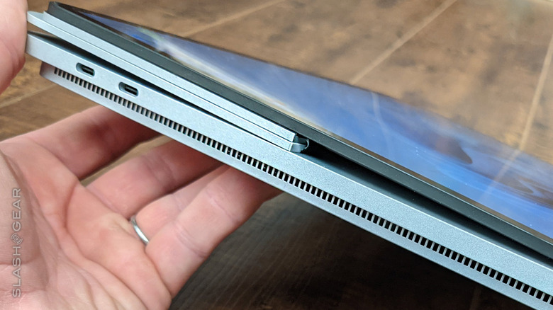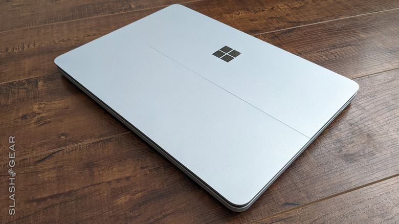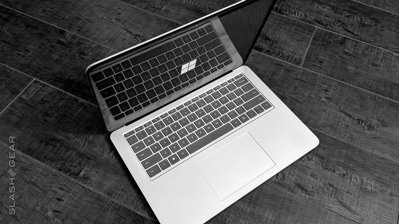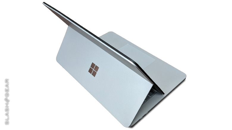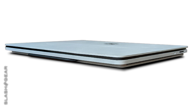 This notebook computer is significantly thicker than most Surface devices. It's effectively two-tiered, with a top level that looks the same as your average Surface notebook, with flat top and bottom and flat edges. Then there's a second tier that's effectively the same thickness as the first, but pulled back a bit, making the top tier appear to float above the surface upon which it rests.