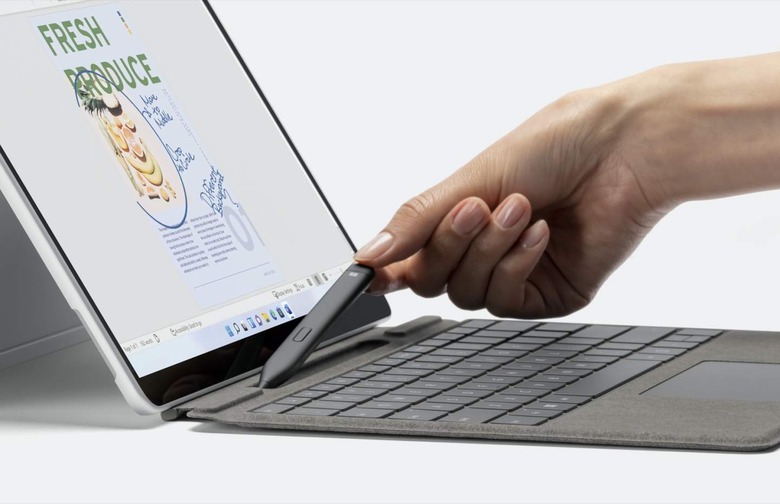 As before, there's Windows 11 on ARM, with support for x86 and x64 emulation. The 13-inch PixelSense touchscreen is carried over too, with a 5-megapixel camera above it, and there are dual far-field Studio Mics. Support for the new Surface Slim Pen 2 is included, too, with a charging nook for the stylus in the Signature Keyboard.