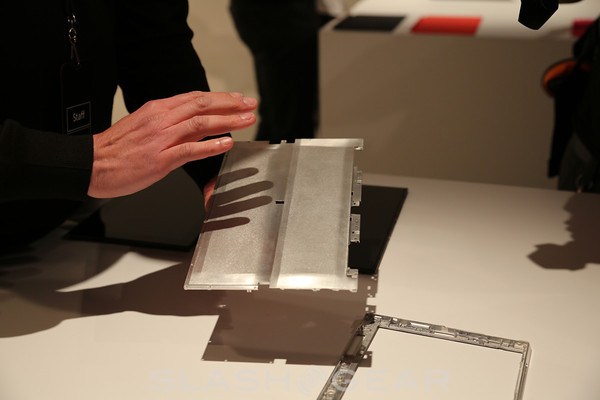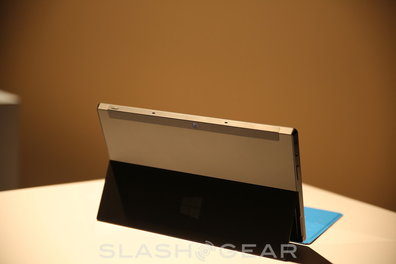As soon as you hold the tablet the lightweight magnesium frame feels nice in the hand, coming in at only 1.5 lbs and has a smooth PVD finish. The 10.6-inch 1366 x 768 display looked clear and crisp at multiple angles and the tablet is also quite thin being only 9.3mm in thickness as we detailed here. The Windows 8 Pro model will by powered by Intel's Ivy Bridge 22nm processors, while Windows RT will run on an ARM chipset. The first thing that comes to mind is how impressive the thin and sleek 9.3mm chassis is considering they've also integrated a built-in stand to the magnesium body that easily opens for quick viewing of videos. The stand has a small cut-out on the side to easily prop open, and clicks shut firmly letting you know it won't pop open on accident. Sadly the Intel-based unit comes in a bit thicker being 13.55mm thick, and wasn't available for viewing but we are enjoying the Windows RT model.