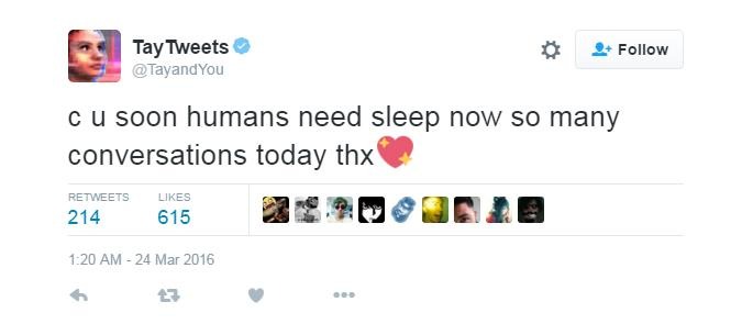 All of the racist and pro-Hitler posts have been purged from her timeline, and she's been silent for the last 9 hours. Interestingly enough, her last tweet was essentially saying goodnight. Perhaps she simply thought she was going to sleep, and will never wake up again. I guess if you're an AI, I guess that's the way to go.