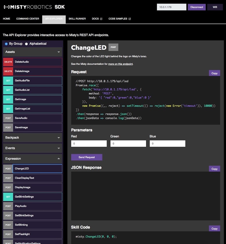 "We're just supporting developers in different spaces," Bernstein explains, and trying to do that as broadly as possible. Misty skills are programmed with Javascript, so that the barrier to entry is low for web and app developers, then loaded into the robot via a web interface. A web-based controller allows you to remotely pilot Misty II, but also generates the necessary code to interface with its sensors, microphones, speakers, and other parts. That can then simply be dropped into your own robot skill program.