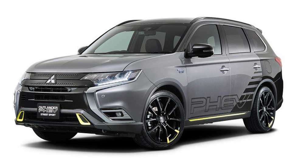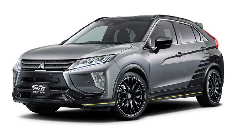 That car will have a heavy-duty carrier installed, LED working lamp, and other features. A customized version of the Outlander PHEV Street sport and Eclipse cross Street Sport vehicles will be at the show. They will have two-tone colors with titanium gray metallic and black mica. The cars are painted with a striped pattern and yellow accents.